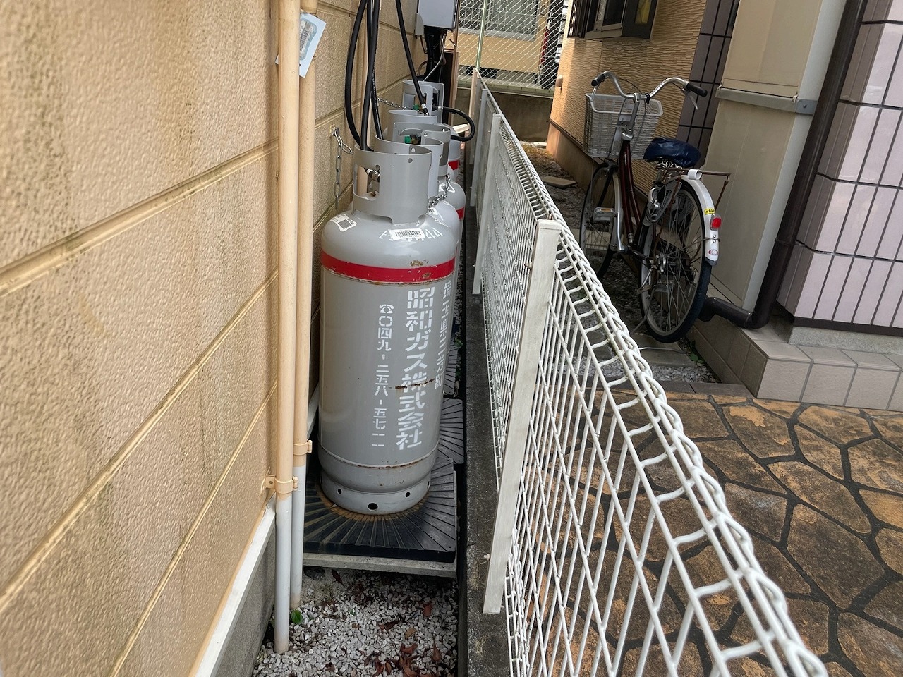 プロパンガスのボンベは足場を組んだ際に交換しにくい場合があります。 工事前に交換時期の確認をご案内しています! |